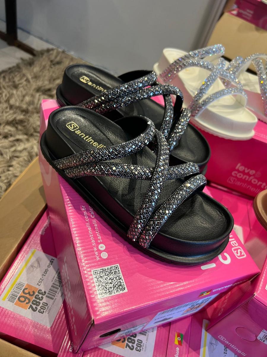Essas sandálias da Santinelli são a definição perfeita de conforto com brilho. Elas unem a tendência das flatforms (solas altas e planas) com um acabamento glamouroso, ideal para quem quer elevar o visual sem abrir mão do bem-estar.