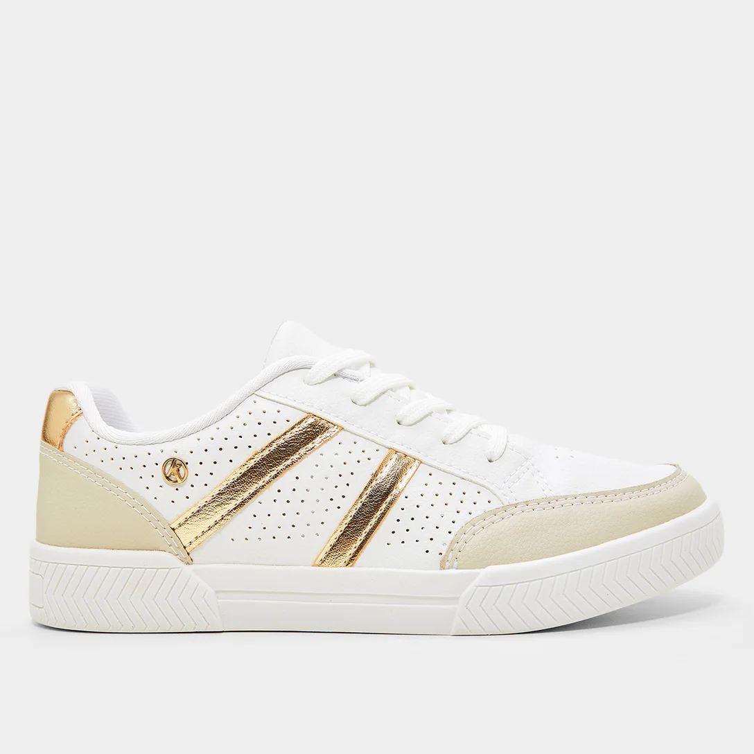 O tênis Kolosh Century C3009B apresenta cabedal em material sintético branco com detalhes dourados e recortes perfurados que promovem respirabilidade. Sua sola é feita em borracha, garantindo boa aderência e durabilidade. O calçado é ideal para quem busca conforto aliado à beleza em um tênis casual.